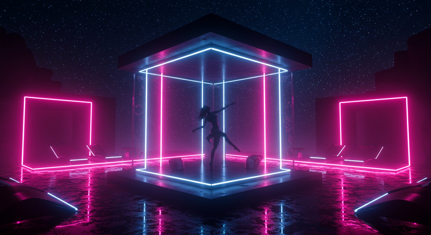 Directed by Allen Swift (who also stars), the scene kicks off with Kitana trapped in a glass box, moving like she’s owning a strip club stage—minus the pole. Clad in a barely-there G-string, a see-through bikini top, and those iconic stripper heels, she’s a vision. The sexbot concept isn’t just a gimmick; it’s a full-on fantasy. Swift plays it up, hyping her AI-operated allure to the audience, promising she’s built for one thing: pleasure. And damn, does she deliver.