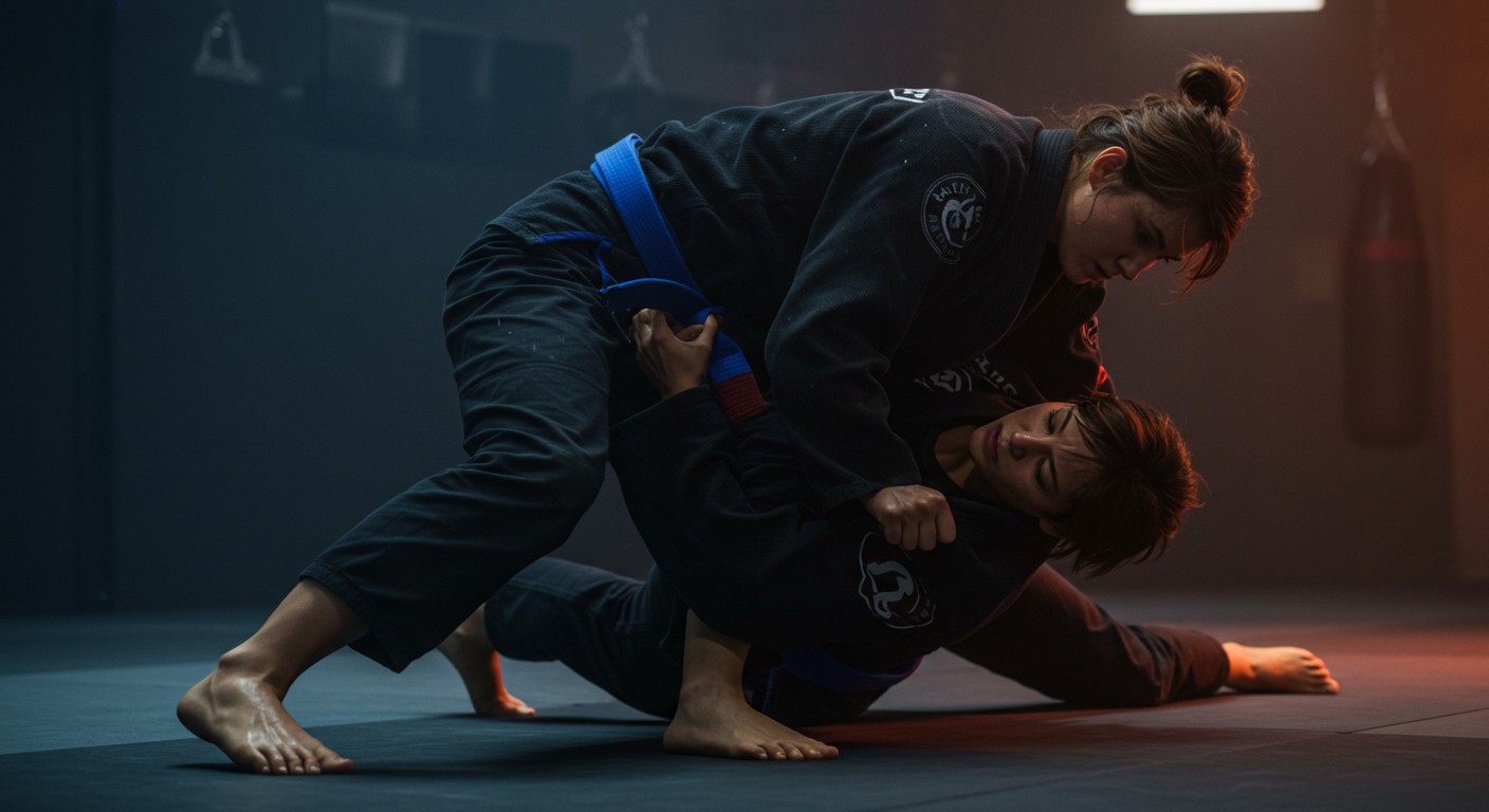 What makes this scene pop? It’s the blend of authenticity and fantasy. The jiujitsu moves are legit—think guard passes and sweeps—but the stakes are pure adult film magic. Tiffani’s determination to “earn her stripes” morphs into a seductive power play that’s as much about personal growth as it is about getting pulses racing. Lexa’s sculpted physique and commanding presence only amplify the heat. It’s not just a scene; it’s a masterclass in blending sport with sensuality.